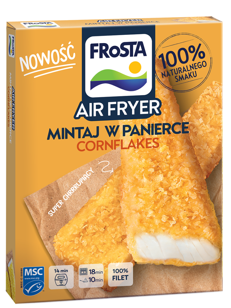 Nasza nowość, Mintaj w panierce cornflakes, to doskonały wybór dla tych, którzy cenią sobie smak i jakość. Chrupiąca panierka i soczysty filet z mintaja stanowią idealne połączenie. Produkt ten, tak samo jak pozostałe produkty rybne FRoSTY, posiada certyfikat MSC, co oznacza, że ryba użyta do jego produkcji pochodzi ze zrównoważonych łowisk .